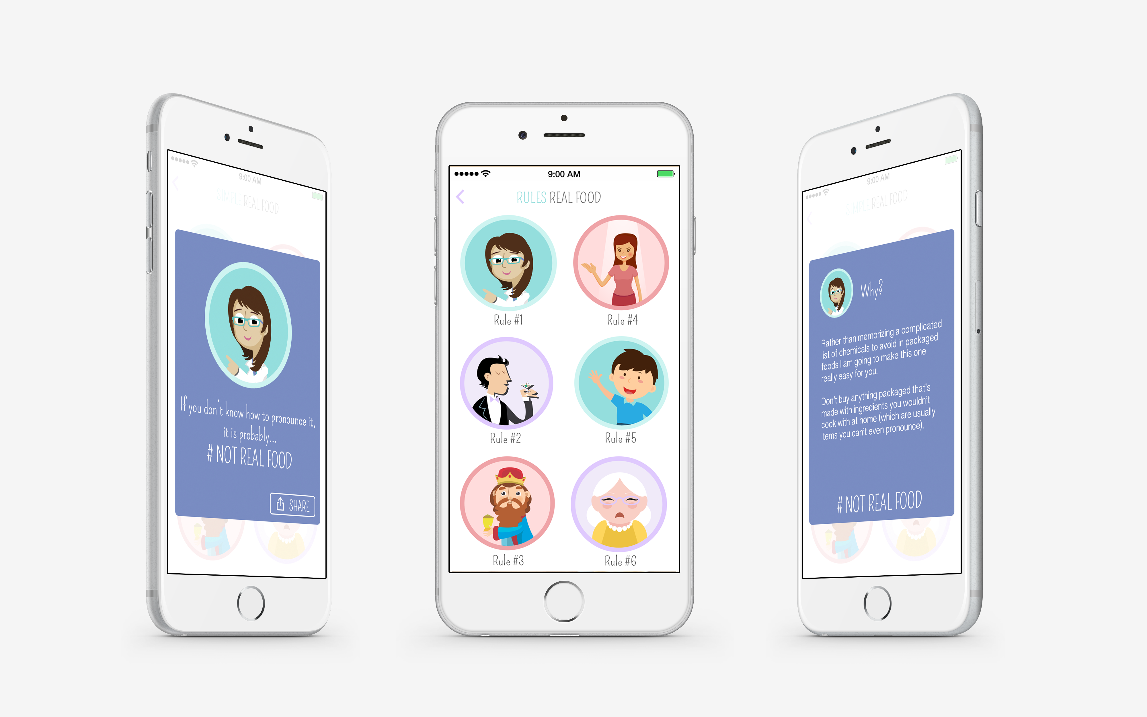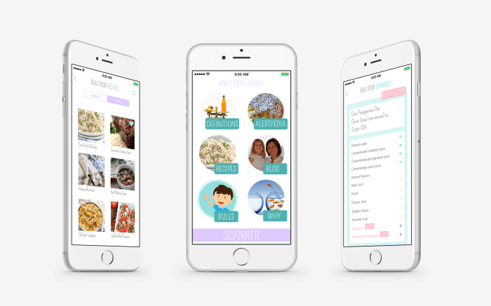 Not Real food is an application I created with the objective of helping people to identify what is “not real food”. It included 6 sharable cards to illustrate 6 ways of identifying not healthy foods, a full definition of the concept “real food”, blog posts, recipes and a scanner that reads ingredients and alert users about certain ingredients.